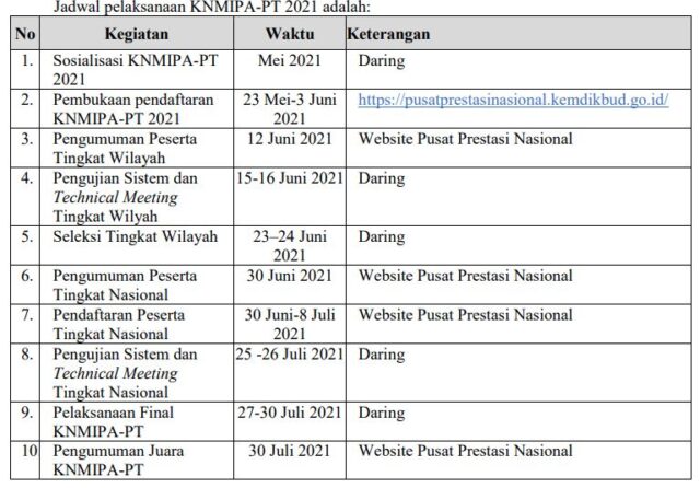 Jadwal kegiatan KNMIPA-PT adalah sebagai berikut: